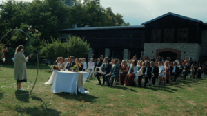 Ślub humanistyczny odbył się na świeżym powietrzu, bezpośrednio przy sali. Piękna uroczystość zaślubin prowadzona była w dwóch językach. Pani Młoda złożyła przysięgę w języku francuskim, natomiast Pan Młody po polsku. Nieważne, w jakim języku by do siebie mówili, od razu można odczytać, że łączy ich wyjątkowe uczucie.