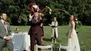 Augustin gra w rugby, więc jak możecie się domyślać, już podczas przygotowań pojawiły się elementy związane z tym sportem. Co dokładnie? Zobaczycie w filmie ślubnym. Mogę jedynie zdradzić, że świadek zrobił Młodej Parze niespodziankę i zamiast podać w odpowiednim momencie ceremonii obrączki, to udał, że ich nie ma. Okazało się jednak, że były przywiązane do piłki, która została rzucona do Pana Młodego. Zdecydowanie było to dla Augustina najważniejsze zagranie do odebrania.